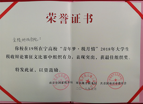 为使税收宣传进一步走进校园,走近学生,走进社会,让税收热点话题得到更深入的研究与思考,5月21日,由南京市国家税务局、南京地方税务局、共青团南京市委员会联合举办了“青年梦•税月情”大学生辩论赛征文活动颁奖仪式。本次征文活动英国上市公司365积极响应,广泛参与,荣获了优秀组织奖。