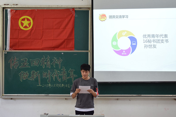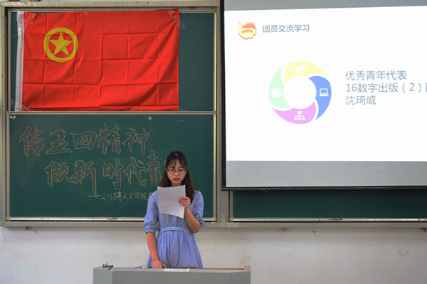 5月2日,习近平总书记走进北大,对话青年,关注青年,寄望青年。在入团仪式结束后,主持人通过视频和图片的形式,带领现场团员们共同学习了习近平总书记的“青年说”。16数字出版(2)班团支书沈琦威、16秘书学团支书孙世友作为优秀团员代表,现场发言谈了学习感悟,深感身为新时代青年所肩负的责任,对自身学习和发展提出了更高要求。最后,童明明老师总结发言,她从青年人的梦想、榜样力量和坚持学习方面,对团员们提出要求:要做有梦想的新时代青年,在实践中发挥榜样的力量,坚持不懈地学习,用实际行动激励更多青年不断前行。