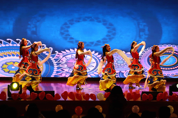 “中华民族一家亲,同心共筑中国梦。”演出开始前,单晓峰书记上台致新年词,表达了对人文师生们的深深祝福。晚会在优美的古典舞《忆江南》中拉开了帷幕,第一篇章“人文芳华”,以悠扬的歌声,优美的旋律,精彩的话剧对白,将现场气氛推向高潮。第二篇章“民韵之风”,同学们用民族舞串烧《舞韵民风》和预科班同学原创诗朗诵《最美的年纪遇见你》,向观众展示了别样民族风情。值得一提的是,少数民族预科班老师阿娜尔与同学帕丽哈同台共舞《黑走马》,时而热烈奔放,时而妩媚动人,将草原上骏马奔驰时矫健姿态的卡拉角勒哈舞蹈表现得淋漓尽致。第三篇章“以心迎新”,少数民族预科班全体同学合唱《行知路的日子》歌曲,表达了对金科的浓浓感恩之情,晚会到此圆满落幕。晚会现场,师生欢聚一堂,一起欣赏着同学们自编自演的节目,为同学们精彩的表演而欢呼鼓掌,体验浓浓的少数民族风情,处处洋溢着师生和谐、民族团结的欢乐景象。