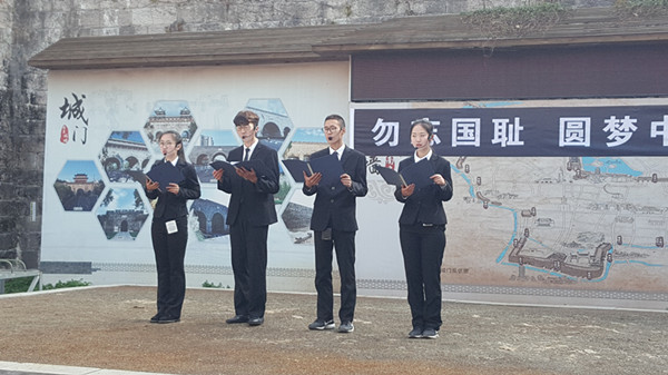 当天寒风凛冽,同学们身着黑色正装,胸前佩戴小白花,表情肃穆。上午9:52,在庄严的国歌中,开始公祭仪式,10:01防空警报拉响,现场老师同学们与南京城墙保护管理中心的工作人员,一起进行了默哀悼念。仪式上,同学们朗诵了戴望舒的《我用残损的手掌》和穆旦的《赞美》两首诗。诗歌《我用残损的手掌》,表现了对祖国命运的深切关注,对象征着 “永恒的中国”的土地,发出深情赞美。而《赞美》则唱出了一曲高昂的民族精神的赞歌,流露出诗人对历史耻辱的悲悯,对民族灾难与命运的忧虑和对人民力量的崇拜。同学们通过深情而铿锵的吟诵,表达了对民族精神的赞扬,对遇难同胞的深切缅怀。
