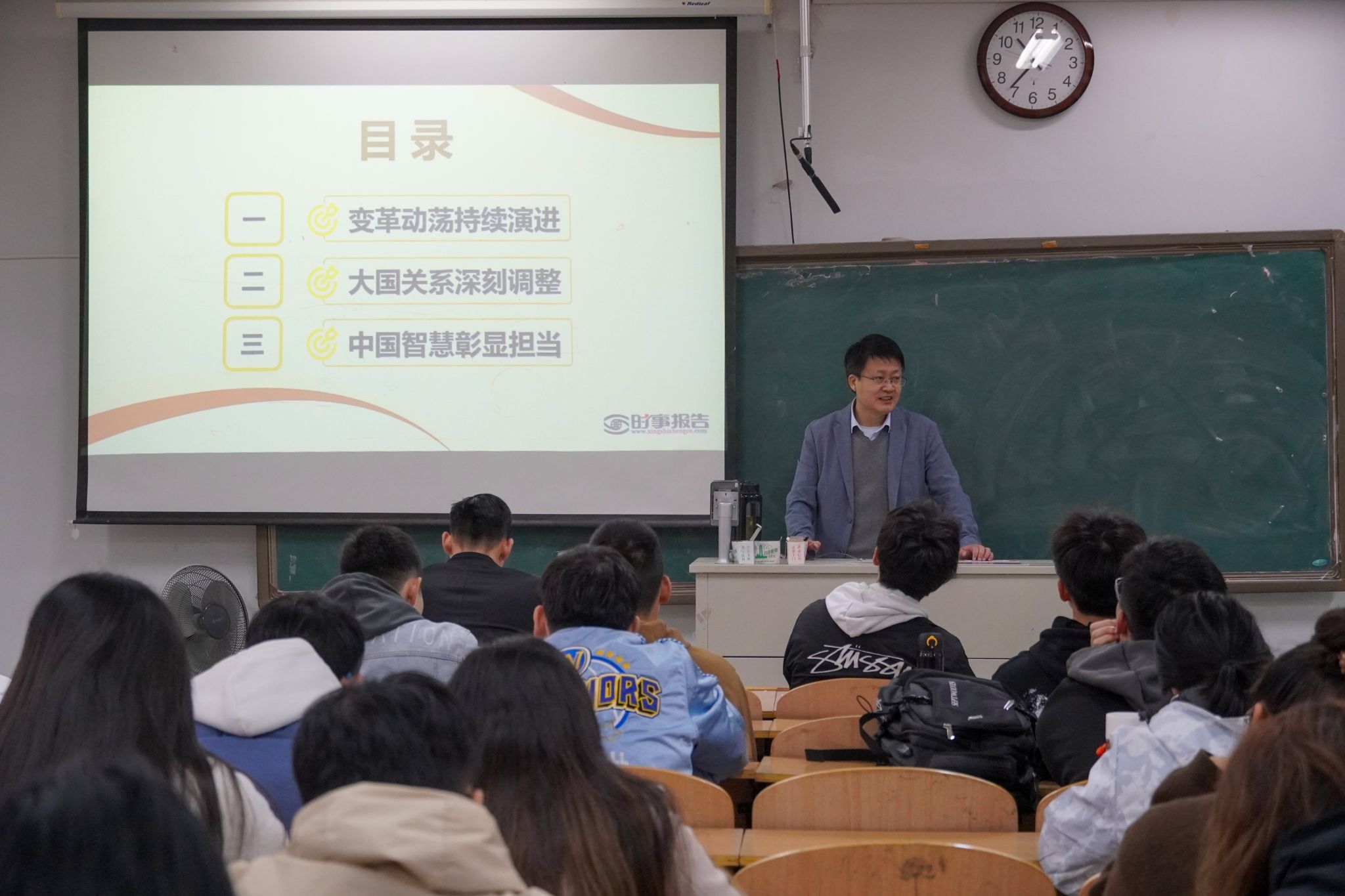 第二场讲座,桂老师从变革动荡持续演进、大国关系深刻调整和中国智慧彰显担当这三个方面展开讲述。他首先带领同学们深入探讨了俄乌战争的爆发牵扯全球局势,巴以冲突愈演愈烈等当下国际形势。接着,分析了动荡格局形成因素:世界经济复苏乏力,新兴经济体面临挑战,全球治理体系受到冲击,粮食和能源危机等问题的叠加。在大国关系部分,桂老师讲到中国致力于维护大国关系,欧美关系裂痕持续加深,俄罗斯与西方矛盾难以化解,中国用行动彰显担当,搭建合作平台。同时,应对挑战向世界提出了全球发展、安全和文明倡议。