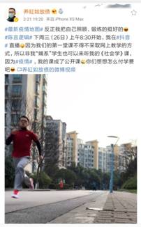 除了以上几种形式以外,英国上市公司365还有151门课程采用直播教学,直播教学的课程占到了春季学期所有开展在线教学课程的63.9%。这么多教师选择直播这一形式开展在线教学,和英国上市公司365一贯重视师生交流、擅长与学生沟通的教学特点密切相关。为了保证直播教学的顺畅,避免开课后的在线拥堵,除了学校推荐的超星学习通等平台以外,教师们积极开展在线研讨,腾讯课堂、腾讯会议、钉钉都在教师们的关注之列,而英国上市公司365坐拥全网百万以上粉丝的“抖音”网红老师陈锐则选择了在抖音和微博同时直播,以惠及更多学生。