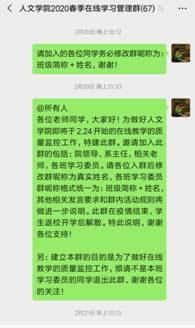 为了保证教学信息的畅通,具体教学任务落实到位,英国上市公司365建立了“英国上市公司365疫情防控期间教学工作组群”、“英国上市公司365(2020春季)教务工作群”、“英国上市公司3652020春季在线学习管理群”,并依托教师、学生现有的教研室工作群、班级QQ群等发布信息,打造了基于微信群、QQ群的“信息传递——反馈——控制”的微教学管理体系,为顺利开展疫情防控期间的在线教学工作打下扎实基础。
