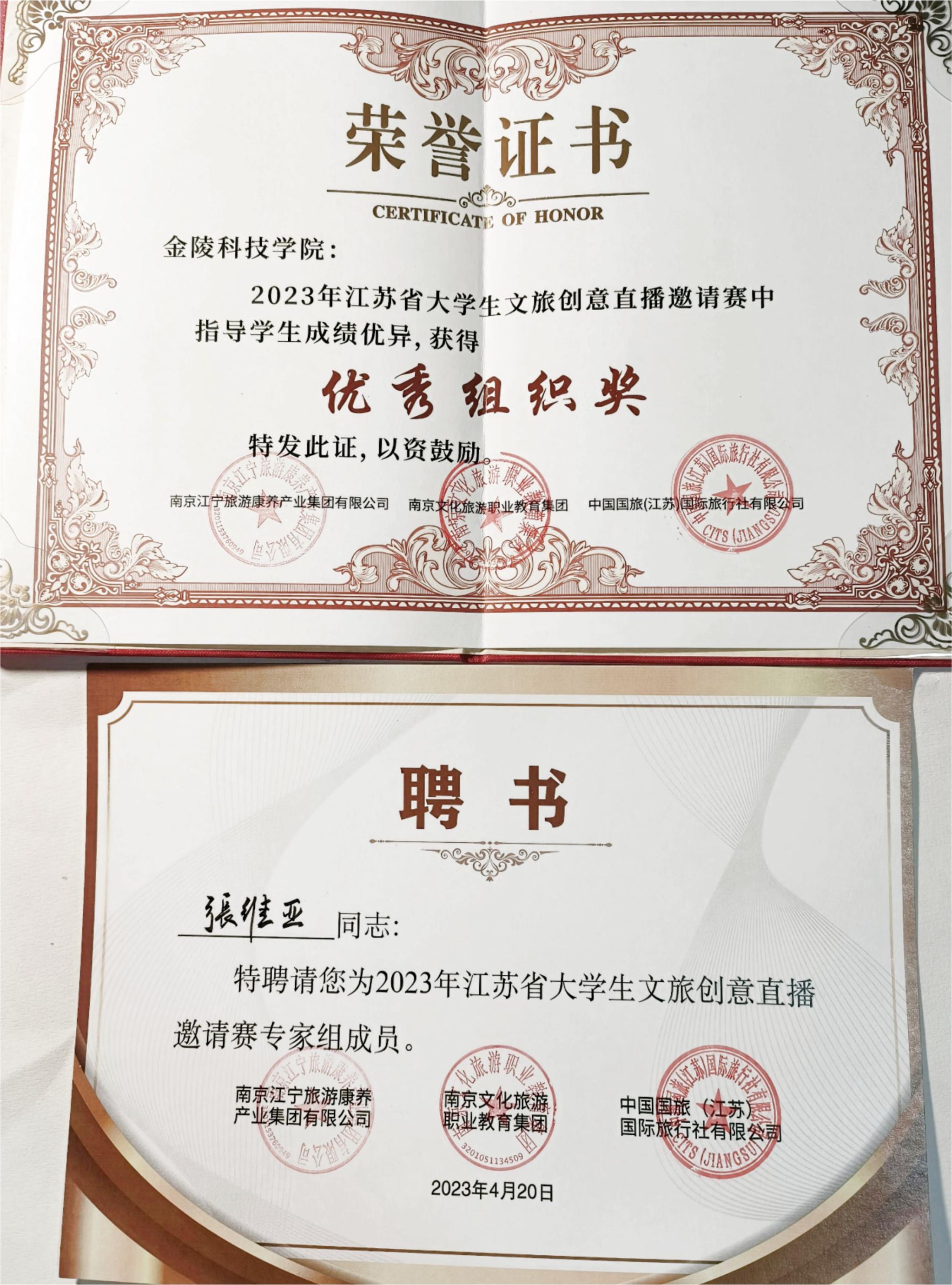 420日,江苏省首届大学生(文旅专业)直播节暨大学生创意直播邀请赛在江宁区湖熟街道钱家渡景区举办,英国上市公司365旅游管理专业六名学生在专业教师陈吉韵、蔡道华指导带领下参赛。此次活动由南京文化旅游职业教育集团,中国国旅(江苏)国际旅行社有限公司,南京江宁旅游康养产业集团有限公司主办。